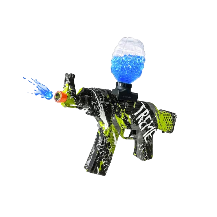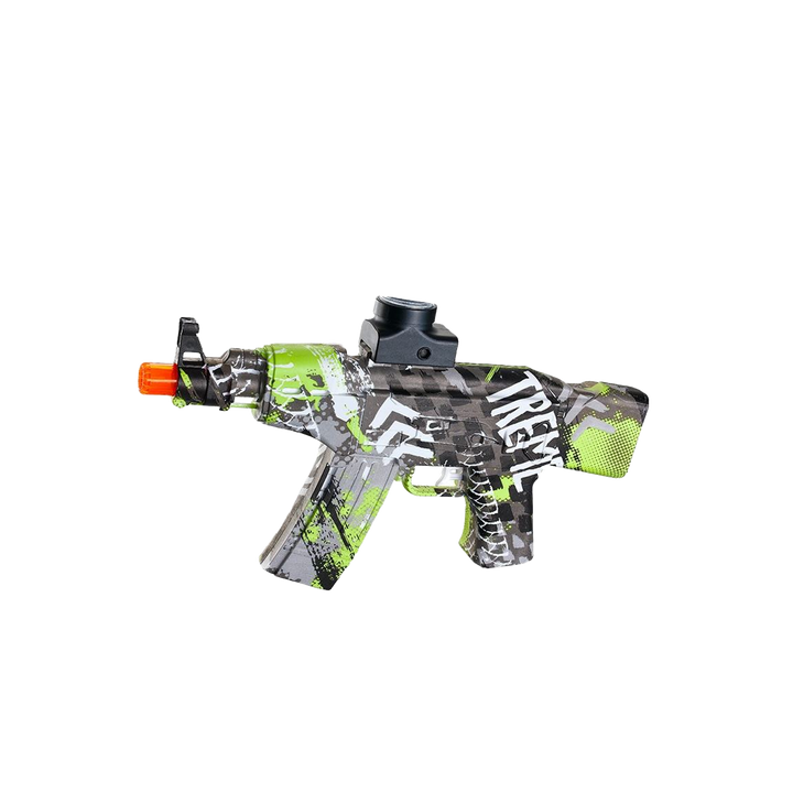 Electric, magazine-fed gel blaster styled after the AKM-47. Rechargeable, automatic firing, intended for recreational outdoor play. Constructed from durable plastic. Supplied with a rechargeable battery, charger, and a starter pack of gel balls.